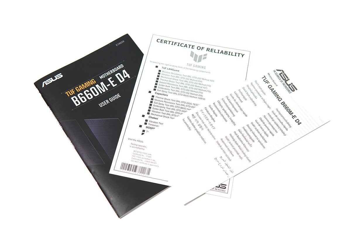 사용 설명서, 빠른 시작 설명서와 함께 TUF 인증 안내서가 포함되어 있습니다. TUF 제품의 경우 여러 가지 인증을 받은 부품(랜 가드, 캐패시터, 초크, FET)과 내용에 안내서가 꼭 포함되어 있습니다.