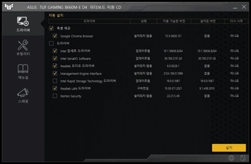 윈도우를 설치한 뒤 구성품에 있는 CD로 칩셋 드라이버와 유틸을 설치할 수 있습니다. 유틸리티는 필요한 것만 설치하시고 칩셋 드라이버는 꼭 설치를 하시기 바랍니다.
