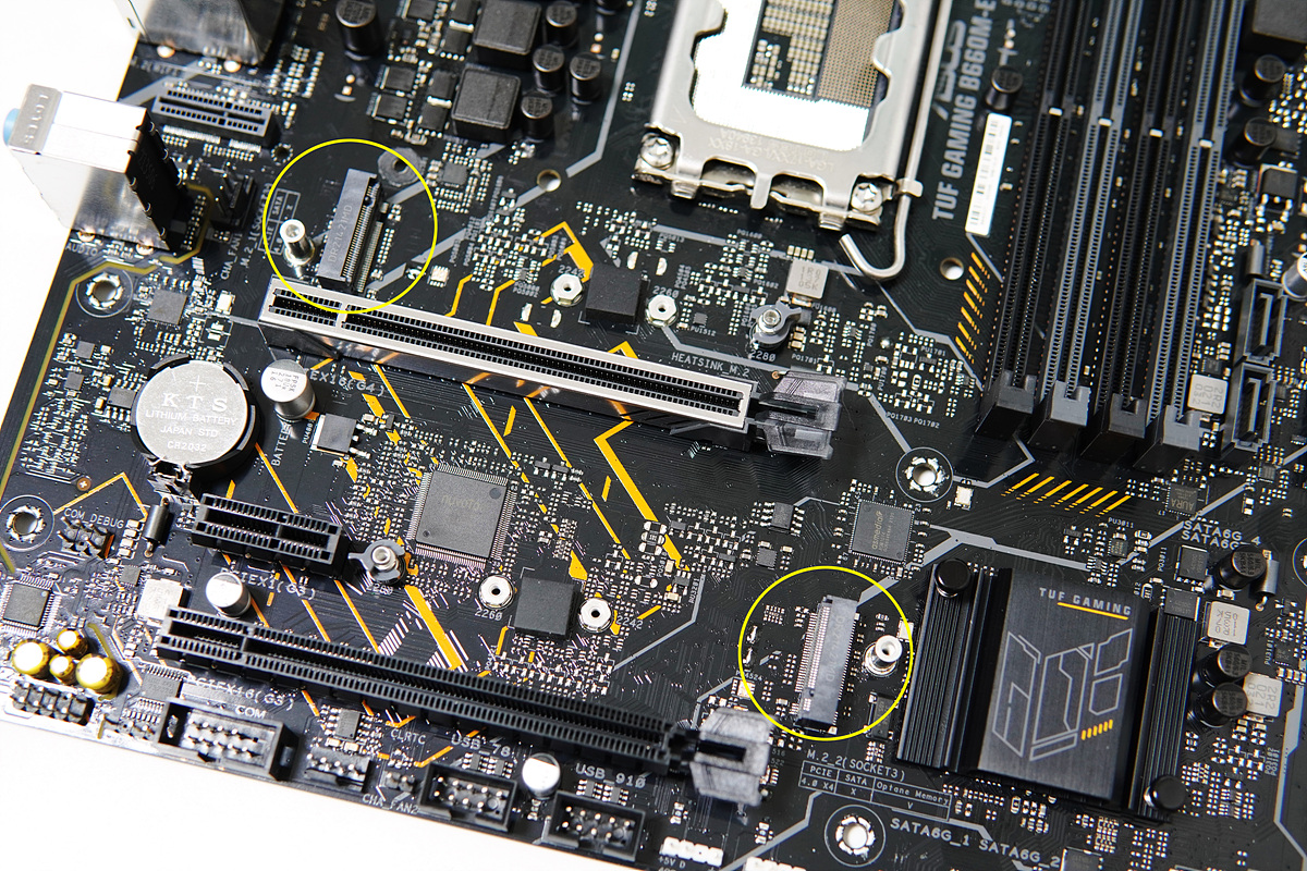 TUF Gaming B660M-E D4 메인보드는 두 개의 M.2 슬롯이 있으며 #1, #2 모두 PCIe 4.0 SSD를 사용할 수 있으며 #1 슬롯에는 방열판이 제공이 됩니다.