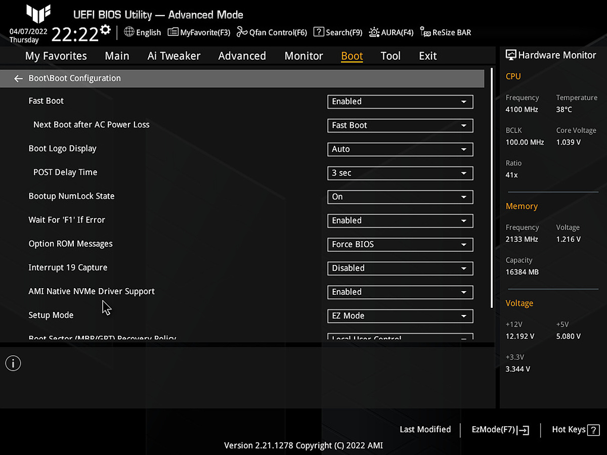 바이오스의 처음 화면은 EZ 모드로 진입하게 되며 이곳에서도 간단하게 대부분의 설정을 바꿀 수 있으며 언어(영어, 한글)도 변경할 수 있습니다.