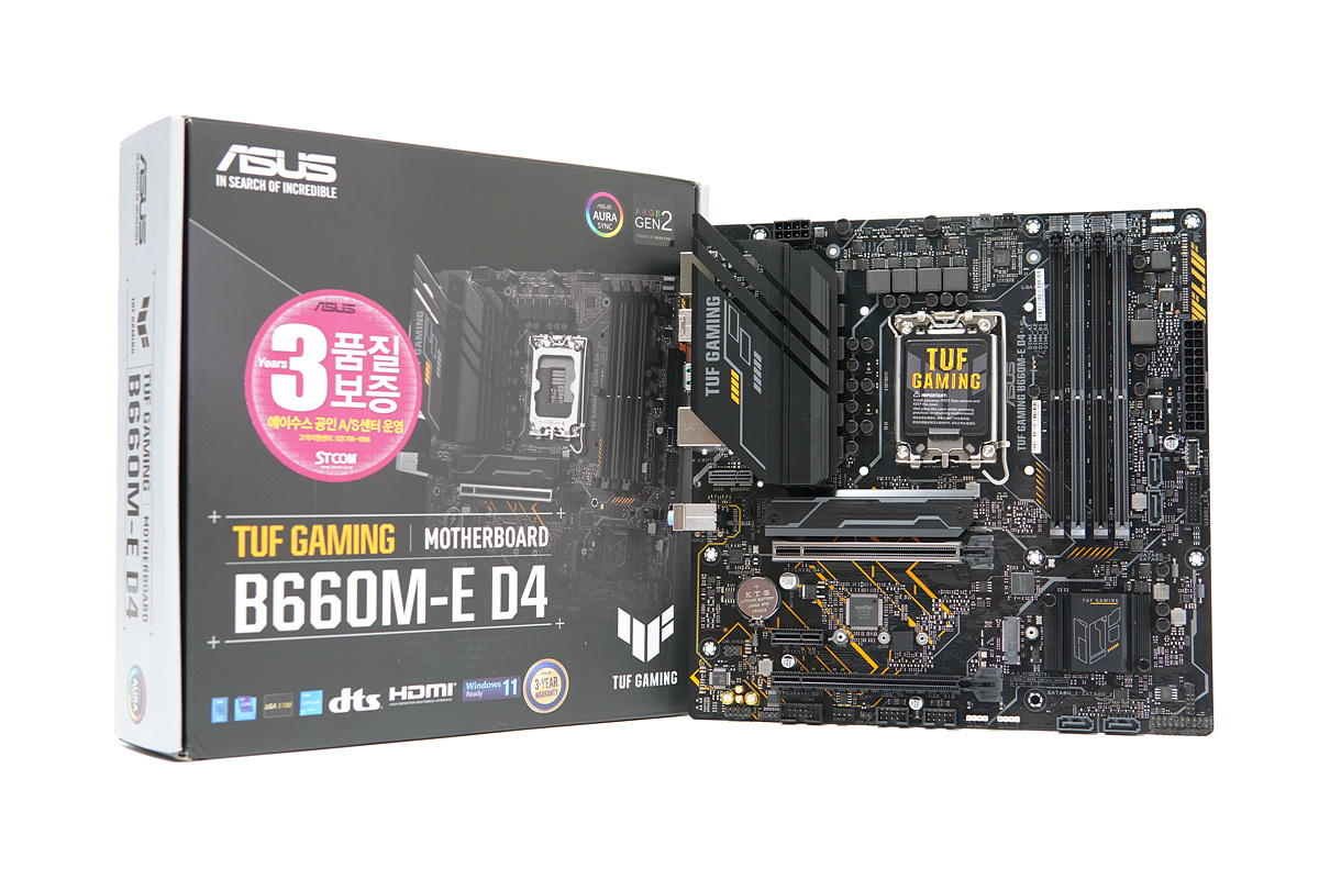 ASUS에서는 PRIME 라인업도 있지만 TUF는 PRIME과 조금 다른 몇 가지 부가기능과 감성으로 차별화를 하고 있으며 사용자들의 반응도 좋은 편입니다. 이번 시간에 소개하는 TUF Gaming B660M-E D4 보드 역시 이런 TUF 감성을 느낄 수 있는 제품입니다. mATX 폼팩터를 가지고 있으며 제품의 이름에서 알 수 있듯이 DDR4 메모리를 사용하고 있습니다. 보드의 레이아웃이나 사용된 칩셋과 함께 어떤 부가기능들이 있는지 자세히 살펴보도록 하겠습니다.