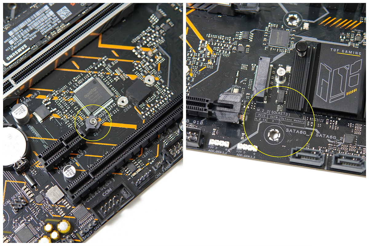 M.2에는 NVMe SSD만 사용할 수 있으며 SATA 방식의 SSD는 사용할 수 없으니 꼭 확인하시기 바랍니다. (옵테인 메모리 사용 가능) M.2 슬롯 끝쪽에는 SSD를 고정할 때 별도의 나사가 필요 없는 Q-Latch가 추가되었습니다.