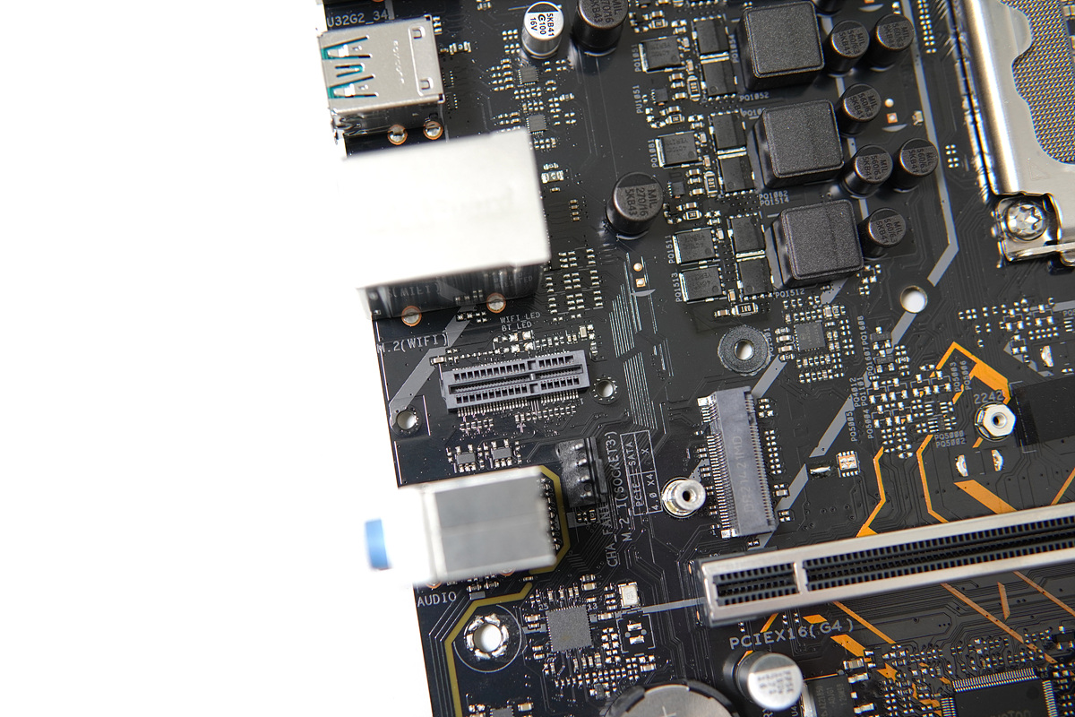 IO 포트를 보면 Wi-Fi 모듈을 장착할 수 있는 M.2 슬롯(Key E)이 있습니다. 무선 랜카드(Wi-Fi 모듈)는 별도로 구입을 해야 합니다. 모니터 리뷰를 하면서 멀티 스탠드에 대한 부분을 칭찬하는 편인데 메인보드에서는 되도록이면 이렇게 무선 랜카드가 있는 제품을 선택하는 걸 추천합니다. 무선(Wi-Fi)이 필요 없다고 할 수도 있지만 아주 가끔씩 정말 유용하게 사용할 수 있으며 특히나 블루투스는 정말 추천합니다. 블루투스 이어폰이나 헤드폰을 PC와 페어링 해서 자주 사용하고 있는데 정말 강추합니다.