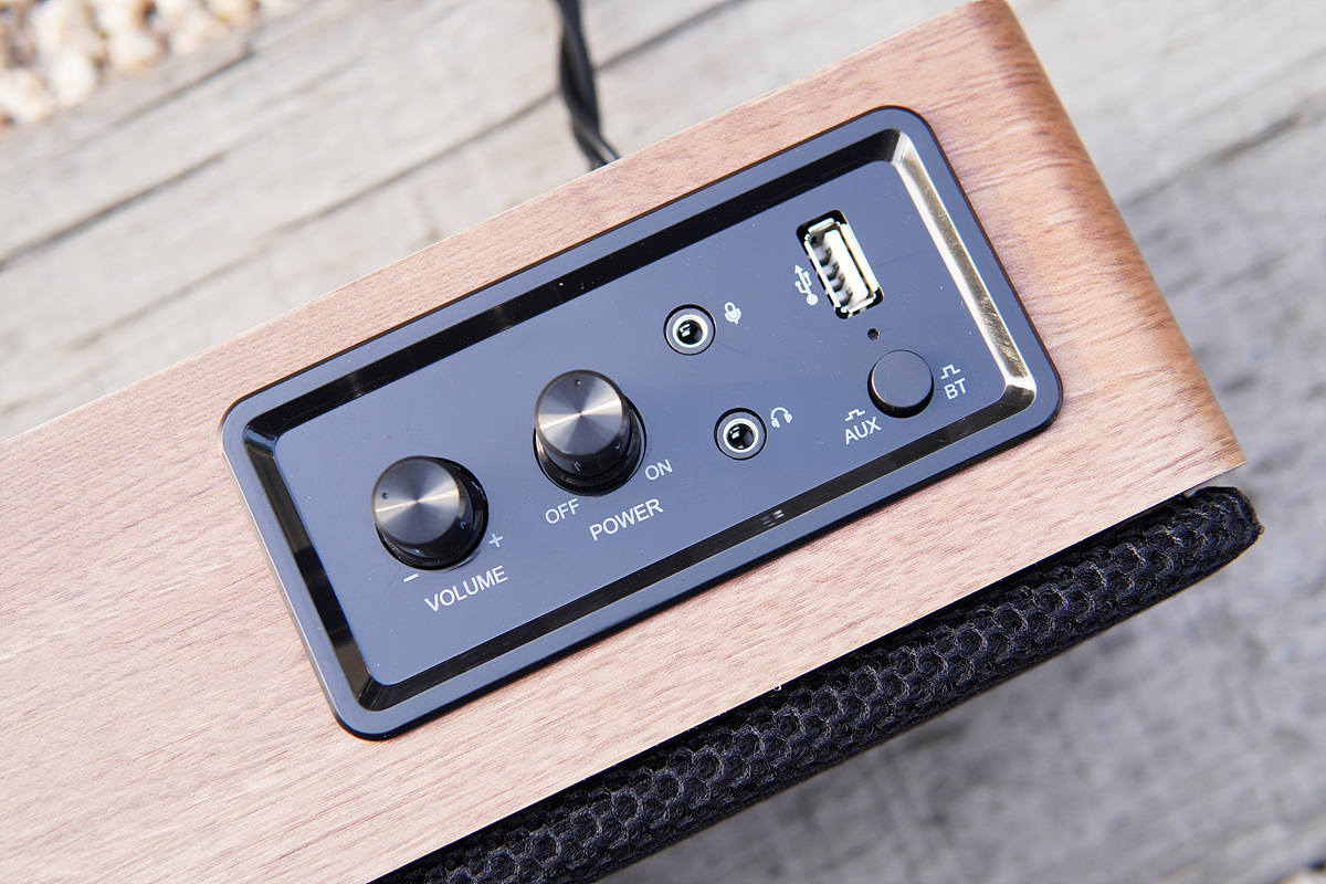 오른쪽에는 제품을 사용할 때 필요한 각종 조절 노브와 버튼들이 있습니다. USB 포트가 조금 특이한데 USB 타입의 무선 헤드셋을 사용할 수 있습니다. 앰프가 내장되어있는 액티브 방식의 스피커에서 3.5mm로 이어폰, 마이크를 사용할 수 있는 경우는 많이 있지만 이렇게 USB 포트로 출력을 하는 경우는 처음이라 조금은 신기하기도 했습니다. Bass / Treble을 조절할 수 있는 노브(konb)가 없는 게 아쉬웠습니다.