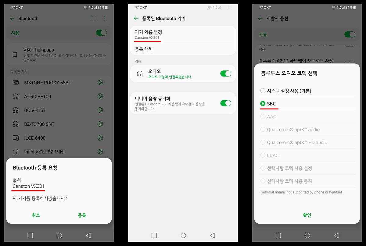 블루투스 버튼을 누르면 자동으로 페어링 모드로 들어가며 다른 기기들과 같은 방식으로 페어링 할 수 있습니다. 아쉽게도 AAC 코덱이 아닌 SBC만 지원합니다.