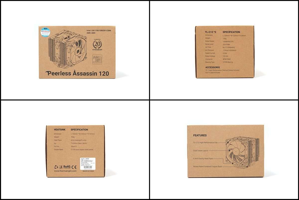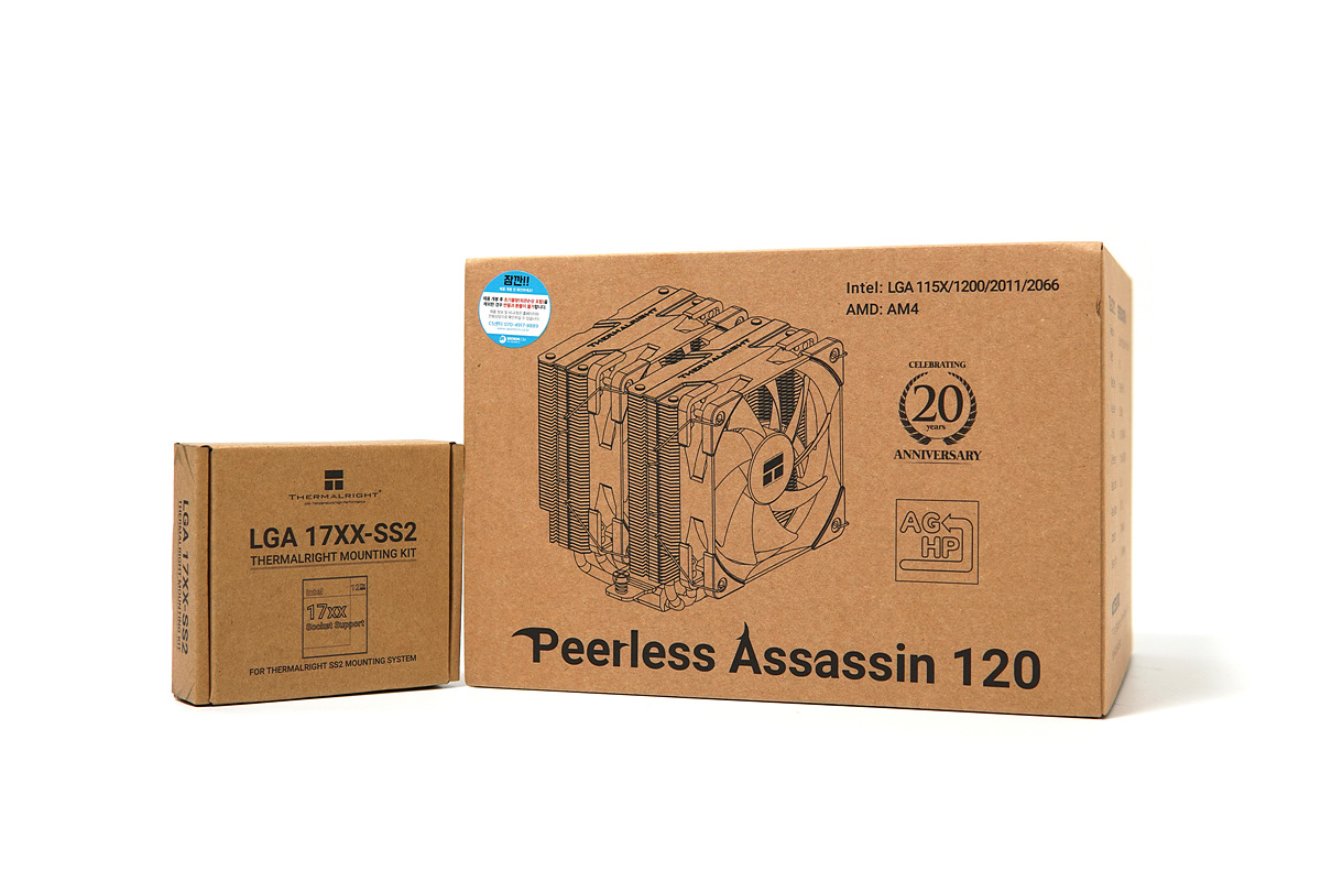 짭수랭이라고 부르는 일체형 수랭 쿨러의 가격이 많이 낮아지면서 공랭 쿨러의 인기는 예전보다는 조금 시들해졌습니다. 하지만 여러 가지 이유로 인해 수랭보다는 공랭 제품을 좋아하는 사용자들도 꾸준하게 유지가 되고 있죠. 대표적인 이유는 누수의 불안이나 설치 방법, 소음과 케이스의 호환 문제가 있을 겁니다. 일체형 수랭 쿨러들의 발전이 있었던 만큼 공랭 CPU 쿨러 역시 방열판의 면적이나 방식 그리고 쿨러의 성능도 많은 개선이 이루어졌으며 가격 역시 이전보다 많이 낮아졌습니다. 이번 시간에 소개하는 써멀라이트 Peerless Assassin 120은 듀얼 타워 구조의 큼지막한 방열판과 함께 120mm 쿨러를 두 개 장착할 수 있는 공랭 타입의 CPU 쿨러입니다.