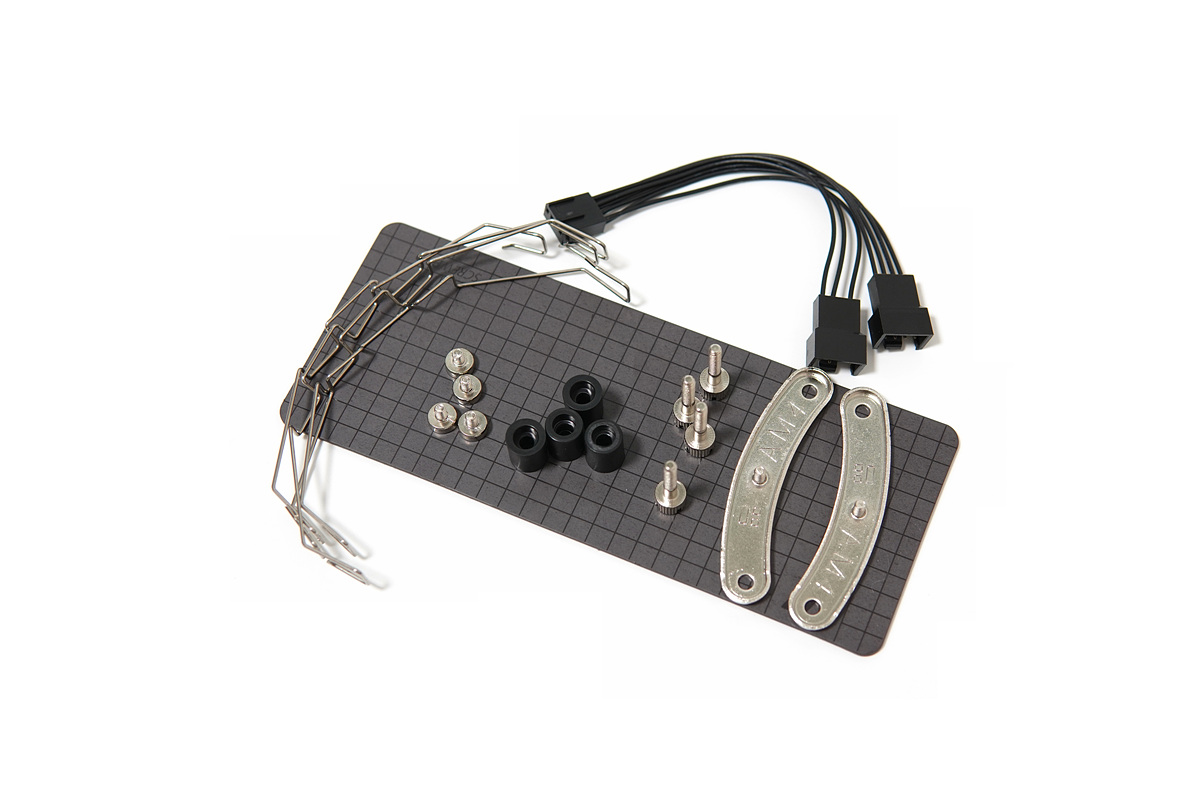 히트싱크와 열을 식혀줄 두 개의 쿨러, 보드에 연결할 수 있는 4핀 커넥터, 써멀 구리스, 팬을 고정할 수 있는 클립 등 여러 가지 부속품들이 제법 많지만 이 부품이 모두 쓰이지는 않고 CPU 소켓에 따라서 몇 개만 사용하게 됩니다.