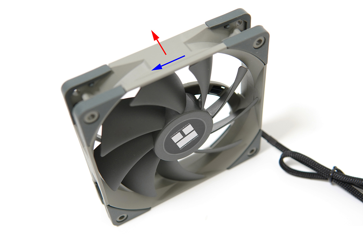일반적으로 쿨러 옆쪽에서는 날개(블레이드)가 돌아가는 방향과 바람의 방향을 화살표로 표시해 두는데 이런 표시가 없더군요. 파란색이 날개가 돌아가는 방향이고 빨간색이 바람의 방향입니다. 방향을 잘못 맞추면 배기와 흡기가 반대로 될 수 있으니 빨간색 표시인 바람의 방향은 꼭 확인하시기 바랍니다.