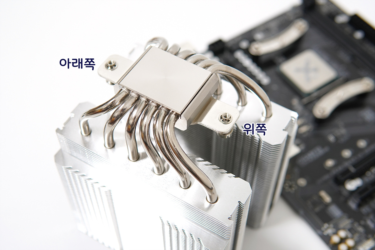 베이스는 구리 니켈의 도금으로 되어있으며 6개의 히트파이프는 구리로 되어있어서 CPU에서 발생된 열을 히트싱크로 빠르게 전달할 수 있습니다.