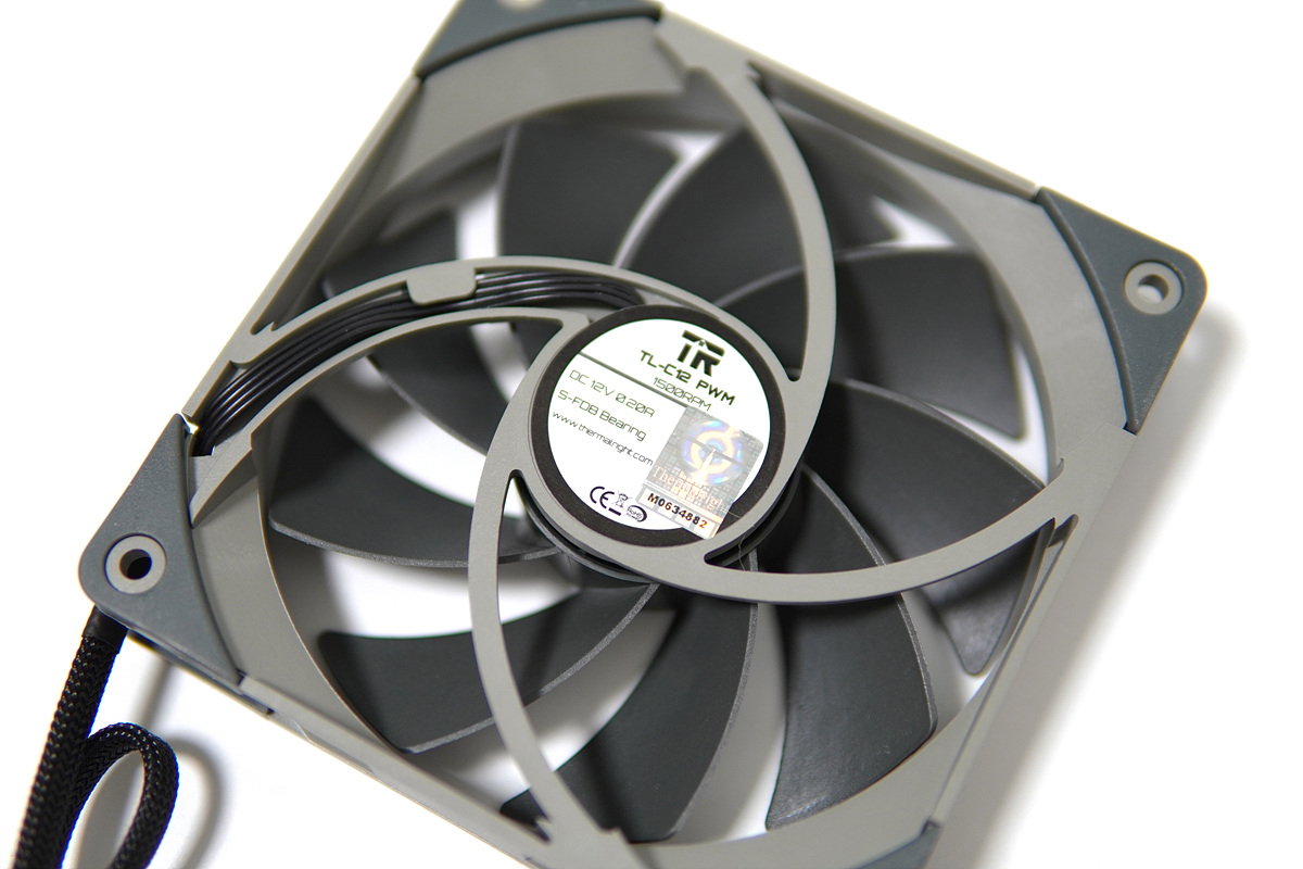 히트싱크로 전달된 열을 빠르게 식혀주는 TL-C12 팬은 9개의 날개(블레이드)로 많은 바람(풍량)을 만들어냅니다. 스펙을 보면 소니의 S-FDB(Fluid Dynamic Bearing)로 저소음과 함께 쿨러의 수명을 더욱 늘렸다고 합니다. (서린의 발표에 따르면 SONY의 S가 아니라고 하네요.)