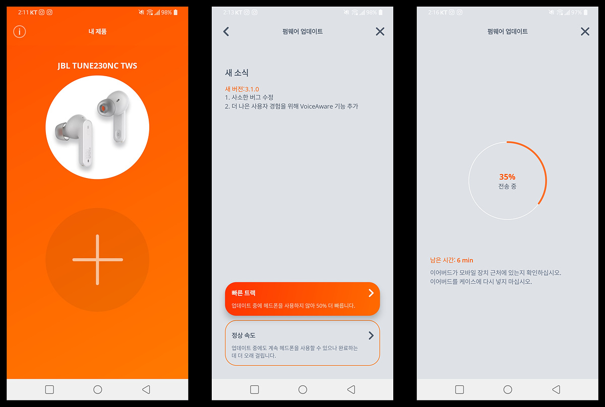 TWS를 소개할 때마다 전용 앱을 많이 강조를 하는 이유는 여러 가지 부가 기능뿐 아니라 이렇게 펌웨어를 업데이트할 수 있다는 장점 때문입니다. 전용 앱이 있다면 기능을 추가뿐만 아니라 제품의 문제가 발견되더라도 펌웨어로 어느부분까지는 수정과 보완을 할 수 있기 때문입니다.