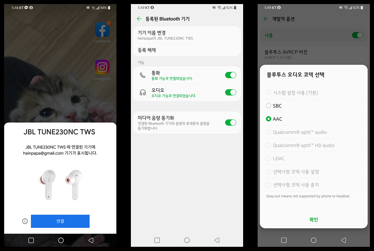 스마트폰을 가까이 둔 상태에서 케이스의 뚜껑을 열거나 이어 버드를 꺼내면 자동으로 JBL Tune 203NC를 인식해서 화면처럼 자동 팝업이 됩니다. 이게 은근히 신기하기도 하고 편리합니다. 다른 기기들과 마찬가지로 블루투스 설정에서 기기 검색을 한 뒤에 페어링을 하는 방법도 사용할 수 있습니다. 블루투스 코덱은 AAC를 지원합니다.