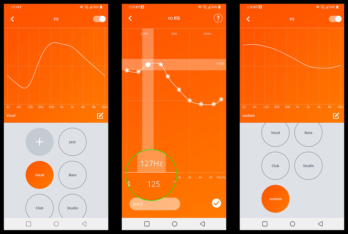 개인적으로 EQ를 칭찬해주고 싶습니다. 기존에 있는 프리셋(preset)을 적용할 수도 있고 나에게 맞게 조절할 수도 있는데 이게 10 밴드나 지원이 됩니다. 그리고 보통은 지정된 구간(Hz)을 선택하는데 가운데 사진처럼 내가 원하는 지점으로 변경(좌우)할 수도 있습니다. 모두 완료가 되면 오른쪽처럼 부드러운 곡선으로 만들어집니다.