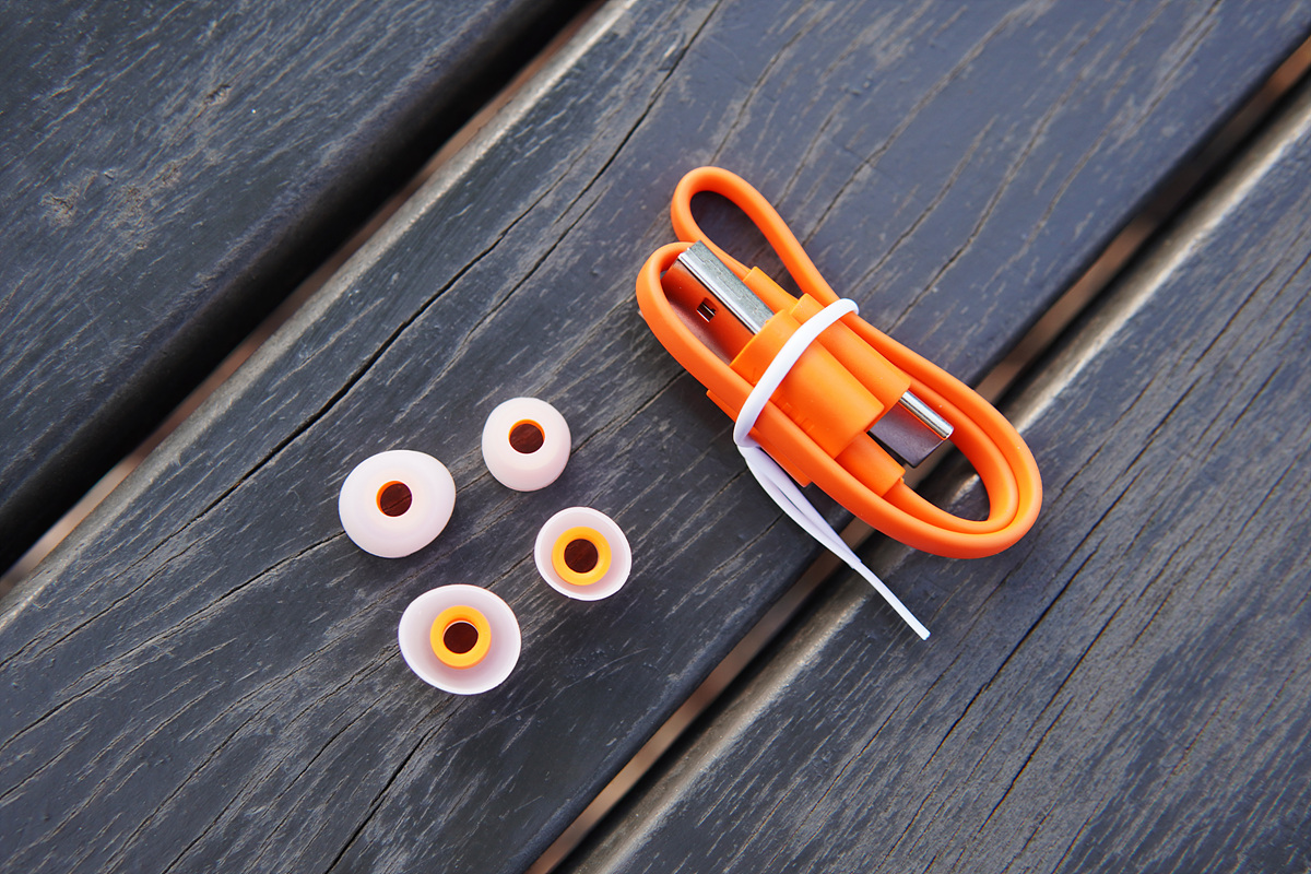 충전 케이블 역시 기존 JBL 제품과 같은 콘셉트이며 이어 팁 안쪽 기둥에는 JBL을 상징하는 오렌지 색으로 되어있습니다. 호불호가 갈릴 수도 있겠지만 저는 나름 포인트가 있어서 좋더군요.