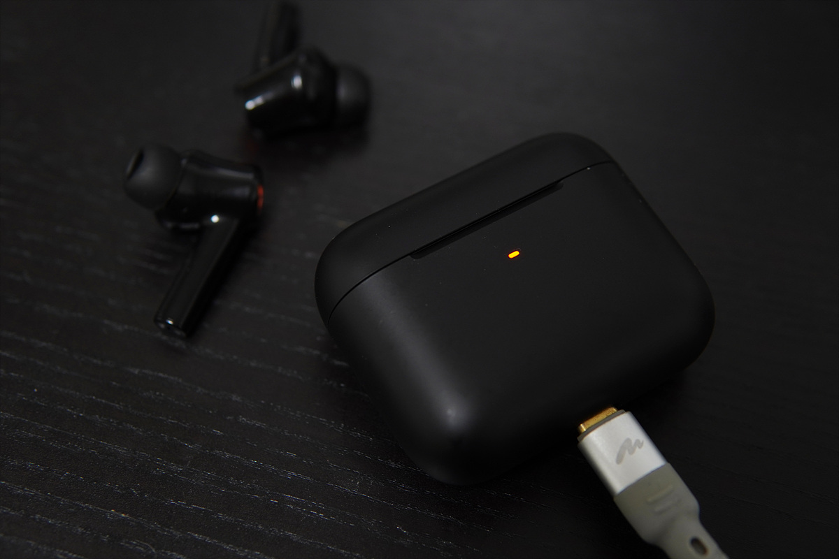 케이스를 열면 보이는 이어버드는 다른 제품들과 확실하게 다른 모습으로 귀상어(Hammerhead)라는 이름이 붙은 이유를 알 수 있었습니다. 케이스 앞쪽에는 배터리 잔량을 확인할 수 있는 상태 표시 LED 있습니다.