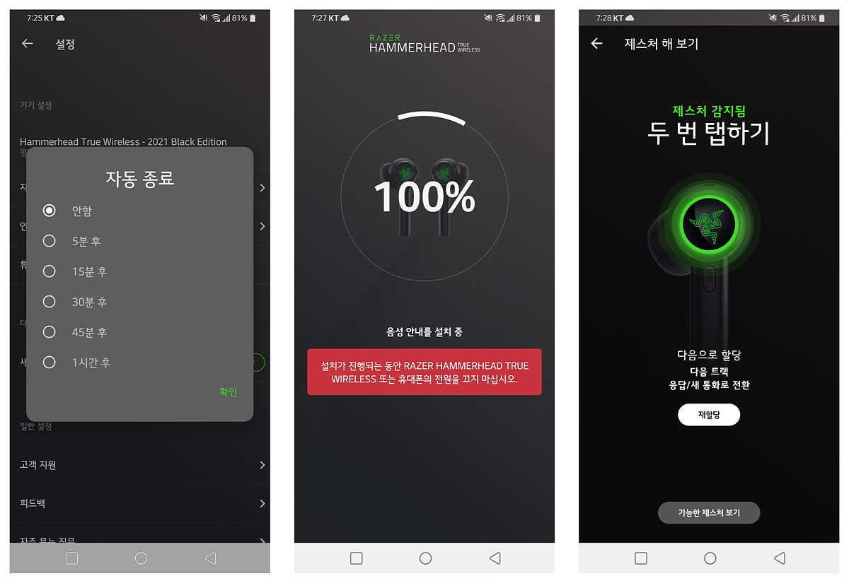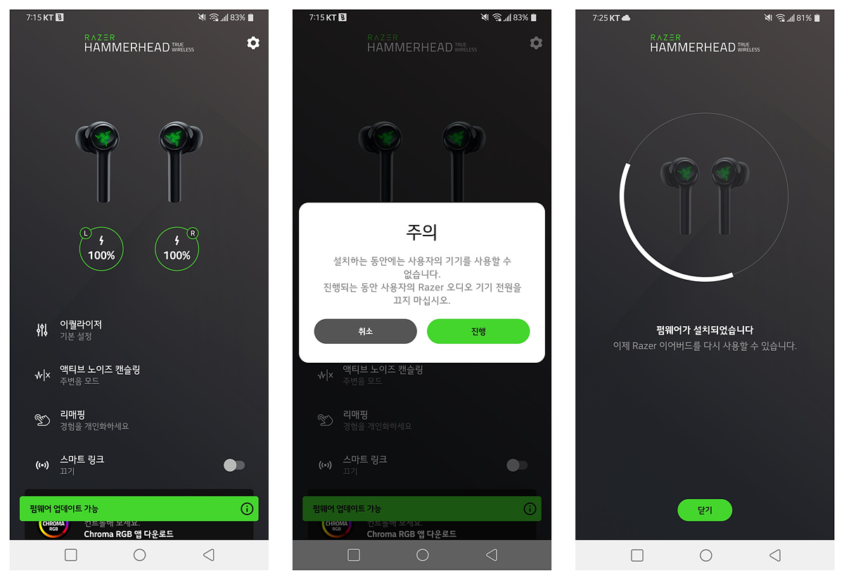Razer Audio 앱을 설치한 뒤 기기를 등록하면 펌웨어 안내 메시지가 나옵니다. TWS 블루투스 이어폰을 소개할 때마다 전용 앱의 중요성을 강조하는 이유가 바로 이런 기능 때문입니다.
