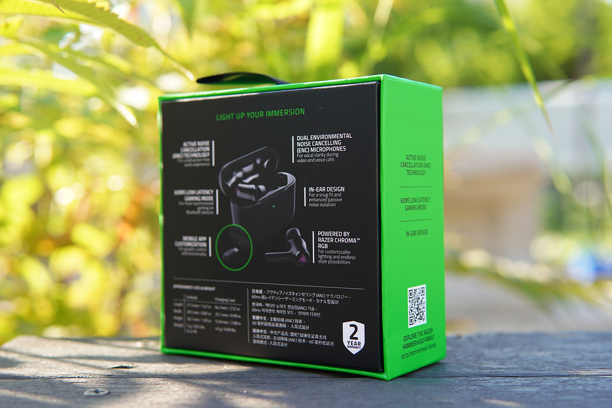 박스는 레이저의 상징인 녹색 콘셉트로 되어있으며 CHROMA RGB, 노이즈 캔슬링, 로우 레이턴시등 제품의 특징들이 표시되어 있습니다. 기능적인 부분들도 그렇지만 저는 2년의 고객지원이 상당히 인상적이었습니다.