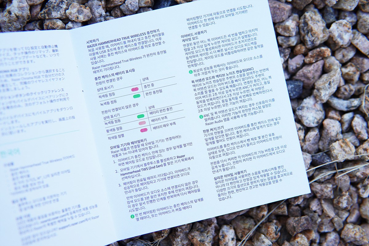 한글이 포함된 다국어 버전의 설명서에는 페어링과 터치 기능에 대해 설명이 되어 있습니다. 터치 기능은 전용 앱에서 사용자가 임의로 바꿀 수도 있습니다.