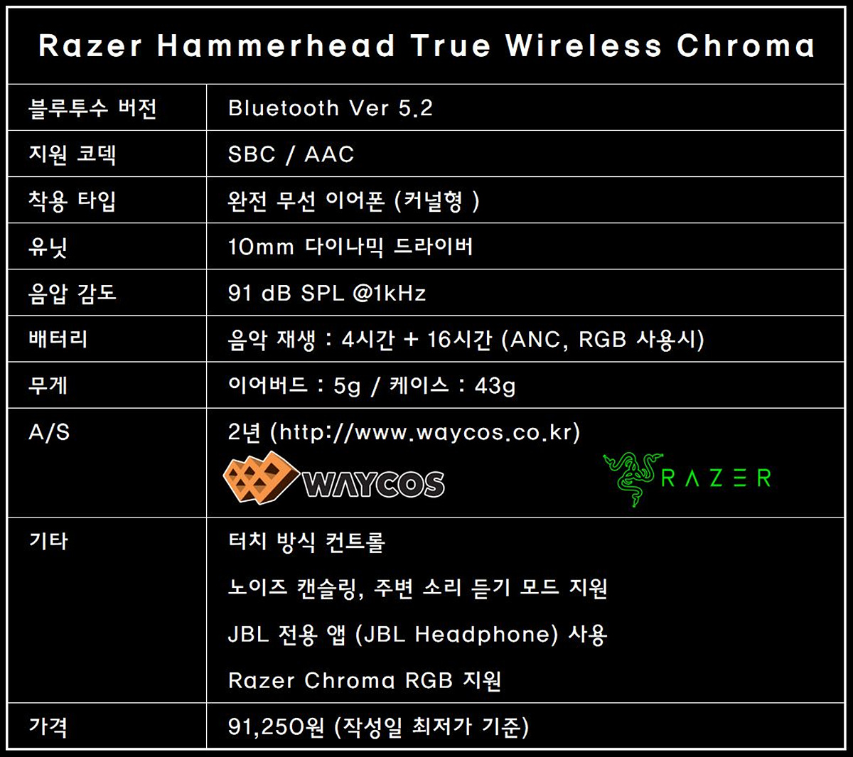 레이저의 다른 제품들과 마찬가지로 TWS 블루투스 이어폰은 Hammerhead(귀상어)라는 별도의 이름을 가지고 있으며 현재는 3개의 제품이 주를 이루고 있습니다. 제가 소개하는 제품은 Hammerhead Chroma로 레이저를 좋아하는 분들이라면 Chroma라는 이름만으로도 바로 RGB를 떠올릴 거라 생각합니다. TWS에서 RGB LED가 필요해?라고 생각할 수 있지만 레이저라면 이야기는 전혀 달라지죠. RGB에 진심인 레이저라면 충분히 인정입니다.