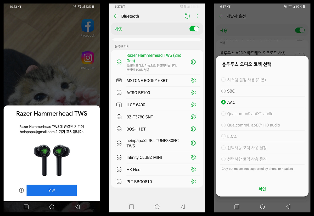 다른 블루투스 기기들과 마찬가지로 페어링을 할 수도 있으며 스마트폰이 가까이 있다면 자동으로 이어폰을 인식해서 팝업창이 나옵니다. JBL 제품에서 자주 보이는 기능인데 꽤 편리합니다.