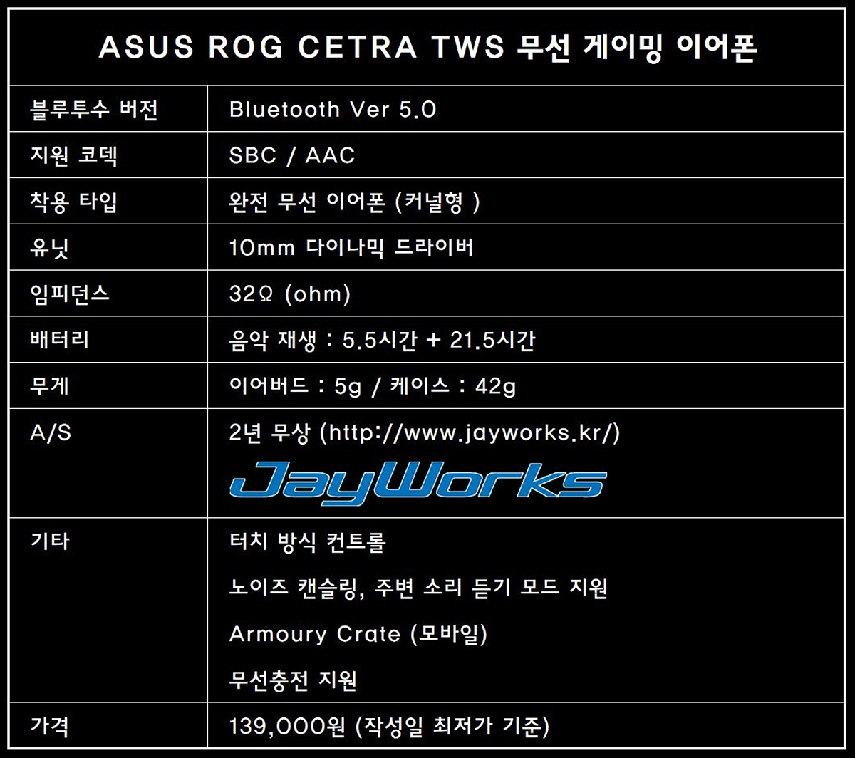 현재 TWS 이어폰들은 상향평준화가 많이 되어서 10만 원 미만대라도 꽤 좋은 제품들이 많이 있습니다. 이런 상황에서 Cetra TWS의 가격을 생각한다면 추천을 하기 상당히 힘든 성능이었습니다. 제목처럼 ROG 감성은 딱 한 스푼 정도밖에 느낄 수 없었습니다. 제품을 제공해준 제이웍스에게는 좀 미안한 마음이 있지만 그래도 현재의 가격대로서는 경쟁력이 상당히 떨어진다고 생각합니다. Cetra의 후속 제품이 나온다면 지금보다는 훨씬 더 많이 다듬어져야 할거 같습니다. 제품의 장단점으로 마무리를 하겠습니다.