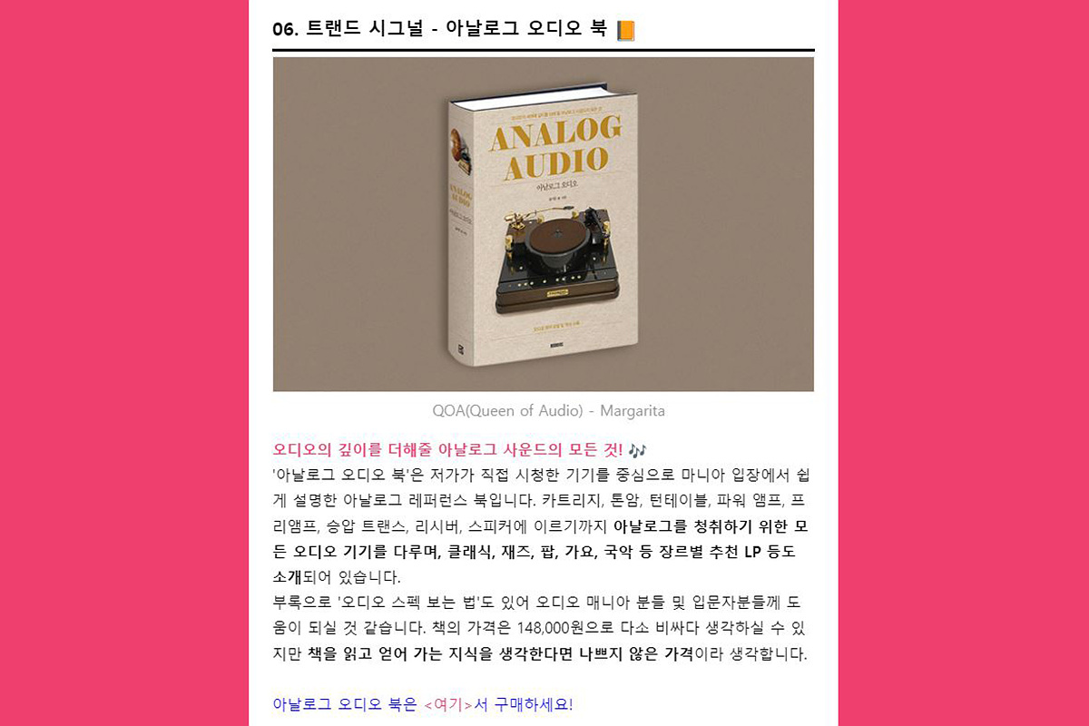 사운드 시그널은 2주에 한 번씩 격주로 발행이 되며 메일로 받아볼 수 있습니다. 사운드 시그널은 음향기기들을 유통하는 사운드캣에서 발행을 하지만 특정 브랜드나 기기만이 아닌 음향에 대한 전반적인 소식과 정보들을 다루고 있습니다. 사운드캣에서 취급하는 특정 브랜드만을 소개하는 뉴스레터였다면 저도 구독하지는 않았을 거 같네요. ^^