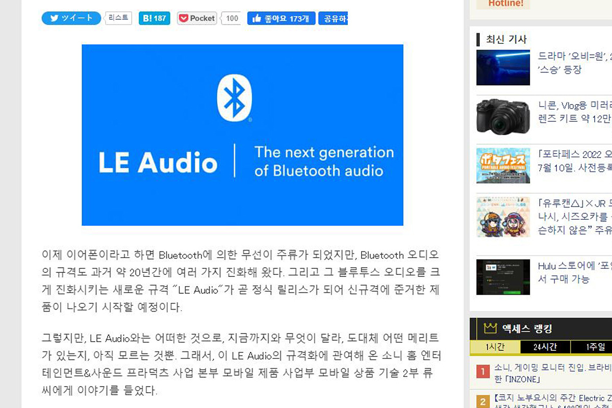 오늘 발행된 소식 중에 제가 찾고 있던 정보가 있어서 완전 반가웠습니다. 현재 SONY LinkBuds S 이어폰을 테스트하고 있는데 이 제품에서 사용된 차세대 오디오 코덱인 LE Audio에 대한 소식이 있네요. 타이밍 굿!