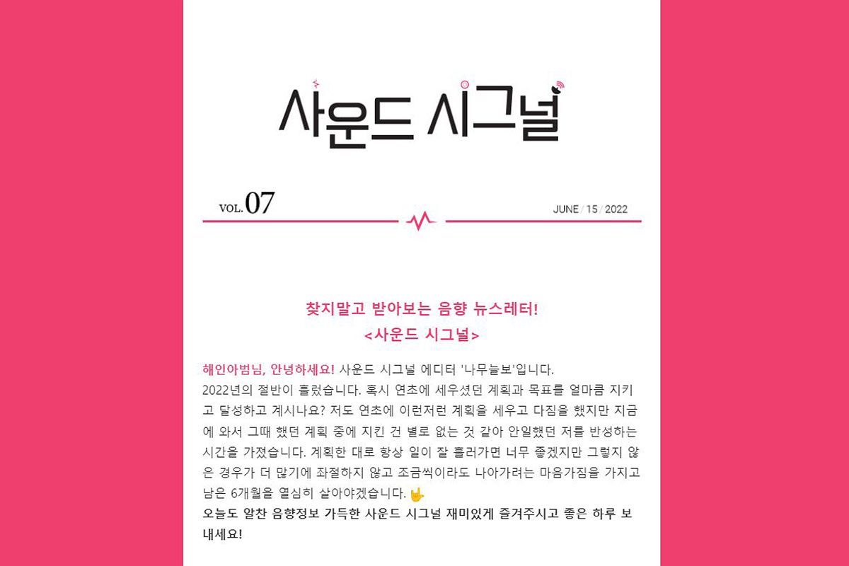 어른이 된 지금에도 이렇게 내가 원하는 분야의 소식이나 정보들을 주로 접하고 있지만 이전과는 다르게 내가 찾아다니지 않고 편리하게 받아서 볼 수 있다는 장점이 있죠. 이번 시간은 제품의 소개가 아닌 특정 분야의 정보를 받아볼 수 있는 뉴스레터(웹진)의 소개로 사운드캣에서 발행하고 있는 사운드 시그널 뉴스레터입니다.