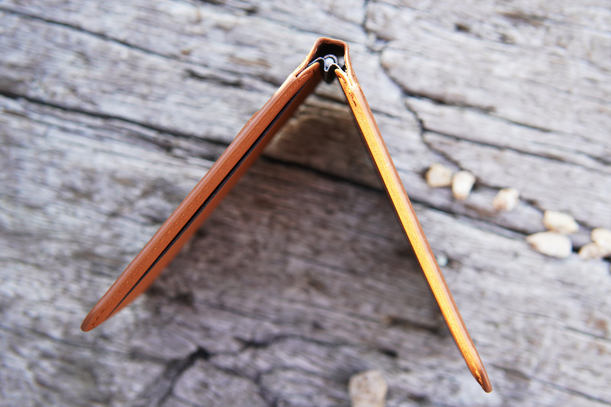 가운데에 힌지가 있어서 15º ~ 160º 사이로 조절할 수 있으며 원하는 각도에 고정할 수 있습니다. 일반적인 카드지갑과 가장 크게 차이가 나는 부분 중 하나입니다.