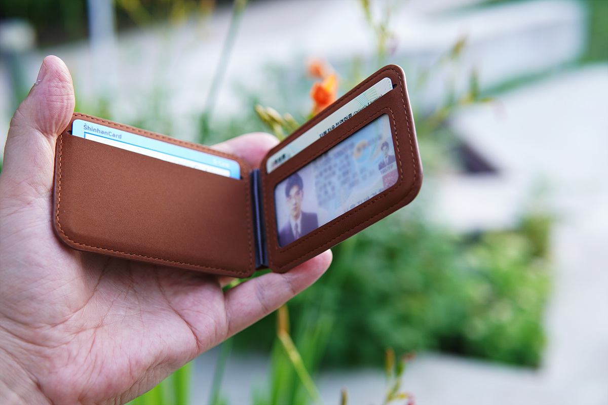 안쪽에는 신분증과 카드 한 개를 더 수납할 수 있습니다. 지갑은 차폐기능이 있어서 지하철이나 버스 같은 대중교통을 이용할 때 교통 카드를 따로 꺼낼 필요가 없습니다.