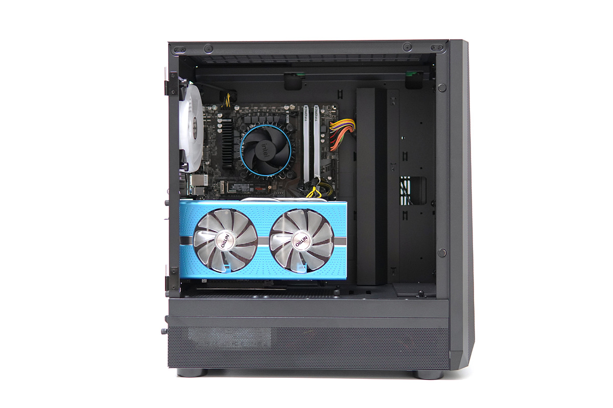 미들타워 케이스이지만 일반적인 미들타워의 케이스보다는 조금 더 큼직합니다. 120mm가 아닌 140mm 팬이 장착이 되다 보니 케이스를 정면에서 봤을 때 가로 폭이 좀 더 큽니다. 파워가 장착되는 부분과 강화유리가 따로 분리가 되어있는 구조이며 아래쪽 커버와 오른쪽 커버에는 별도의 홀(hole)이 있습니다.