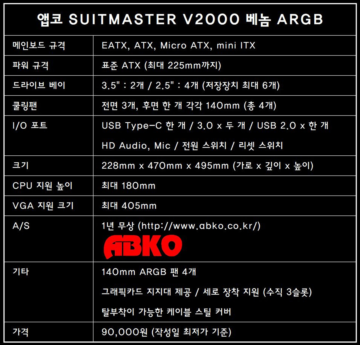 이번에 소개하는 앱코 수트마스터 V2000 베놈 ARGB는 미들타워로는 크기가 좀 큰 편으로 조립에 따른 편의성이나 여러 가지 추가 기능이 상당히 많은 케이스입니다. 140mm RGB 쿨러가 기본 4개가 장착되었으며 VGA 거치대뿐 아니라 세로로 장착할 수도 있으며 케이블 커버가 있어서 깔끔하게 마무리를 할 수 있습니다. 이외도 여러 가지 편의 기능이 있는데 제품의 가격이 9만 원이라는 점 역시 꽤나 인상적이더군요. 실제 조립 편의성이나 기능들은 어떨지 자세하게 살펴보겠습니다.