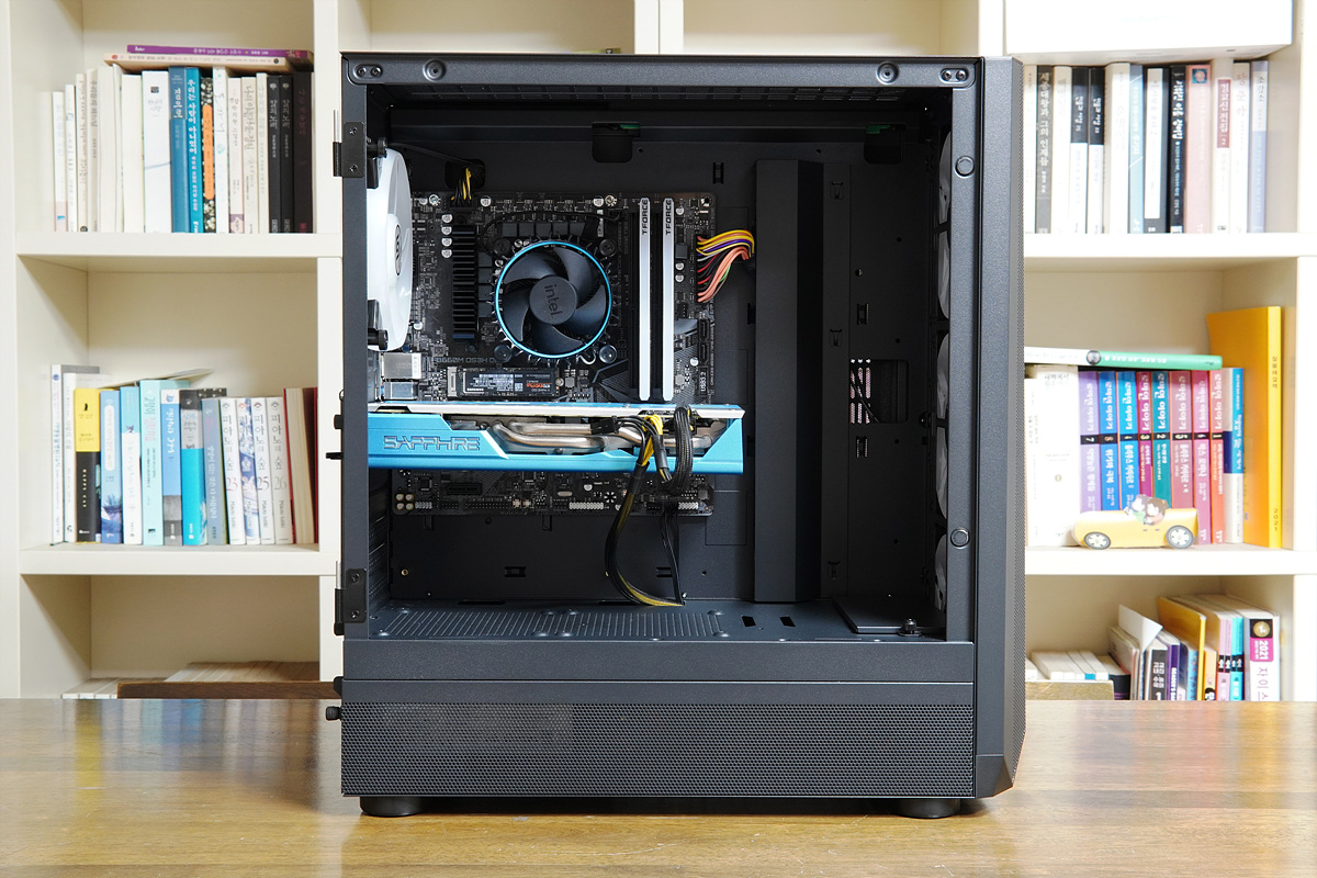 조립이나 사용을 하면서 PCI 가이드(수평)가 일체형인 부분을 제외한다면 딱히 단점이라고 생각될만한 부분은 찾기 힘들 정도로 만족스러웠습니다. 바닥의 먼지필터가 슬라이딩 방식이었다면 더 좋았겠지만 실제로 탈부착할 때도 케이스를 들지 않아도 어렵지 않게 장착할 수 있었고 라이저 케이블 고정 부분은 세로 장착을 하지 않는다면 불편하지 않겠지만 그래도 후속 제품이 나온다면 개선이 되었으면 합니다. 장단점을 끝으로 마무리를 하겠습니다.