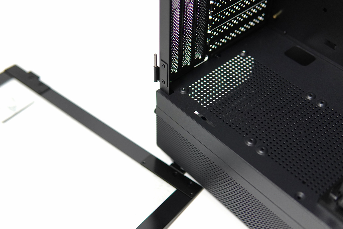 케이스 아래쪽의 공간에 손을 넣어 잡아당기면 앞쪽 커버를 분리할 수 있습니다. 커버는 타공망으로 되어있어서 흡기에 도움을 주고 있으며 별도의 먼지필터는 없습니다. 이 부분은 호불호가 좀 나뉠 거라 생각하는데 개인적으로는 타공망에 먼지필터까지 있으면 흡기에 도움이 되지 않는다고 생각해서 딱히 단점으로 느껴지지는 않았습니다. 또한 커버는 사진처럼 완전히 분리가 되어 먼지 필터가 없어도 쉽게 청소할 수 있습니다.