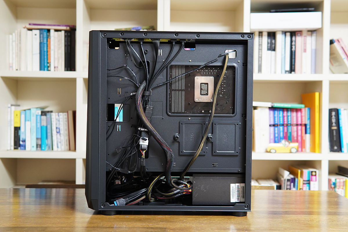 저장장치는 2.5인치 두 개, 3.5인치 두 개 총 4개까지 장착할 수 있으며 케이스의 공간이 많아서 선정리를 할 때도 좀 더 쉽게 할 수 있습니다. 필요 없는 케이블을 둘둘 말아서 안쪽으로 밀어 넣으면 끝~~ 이죠. ^^