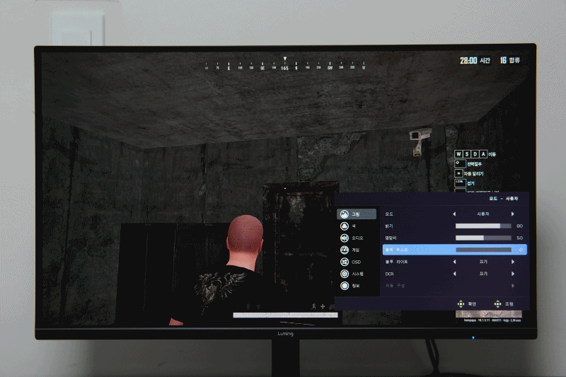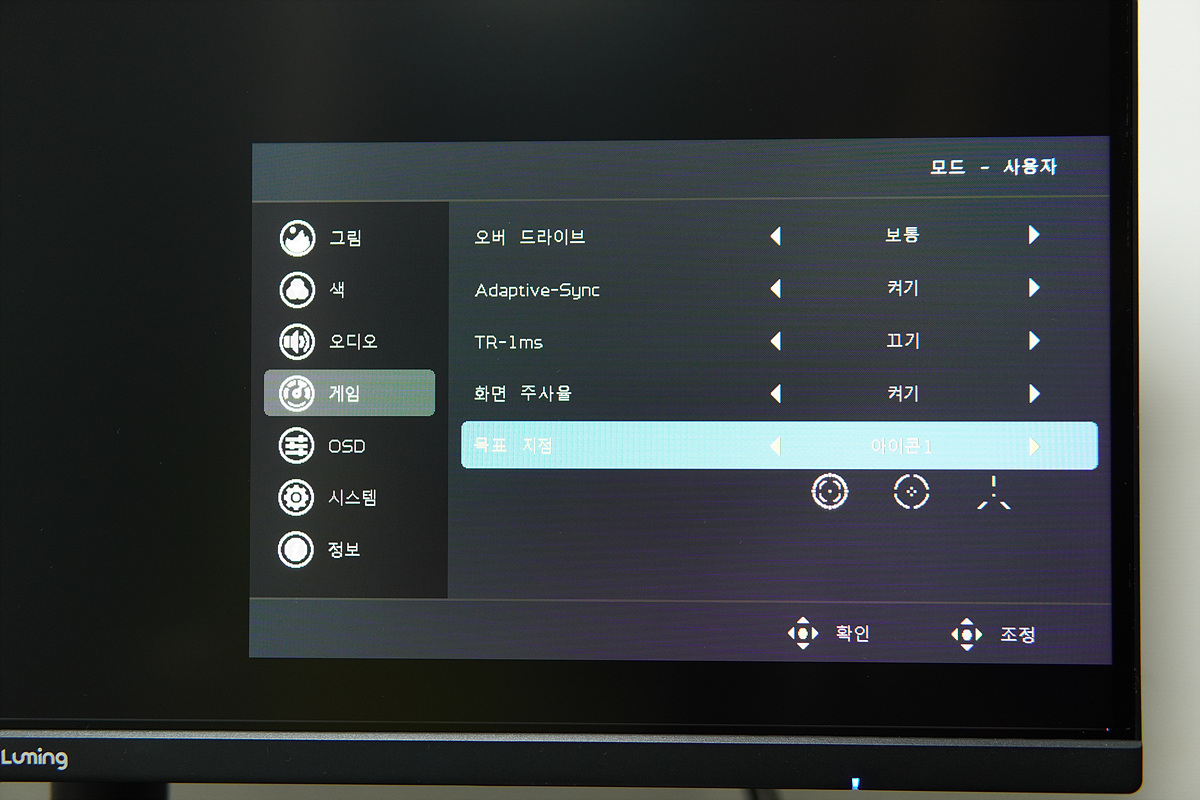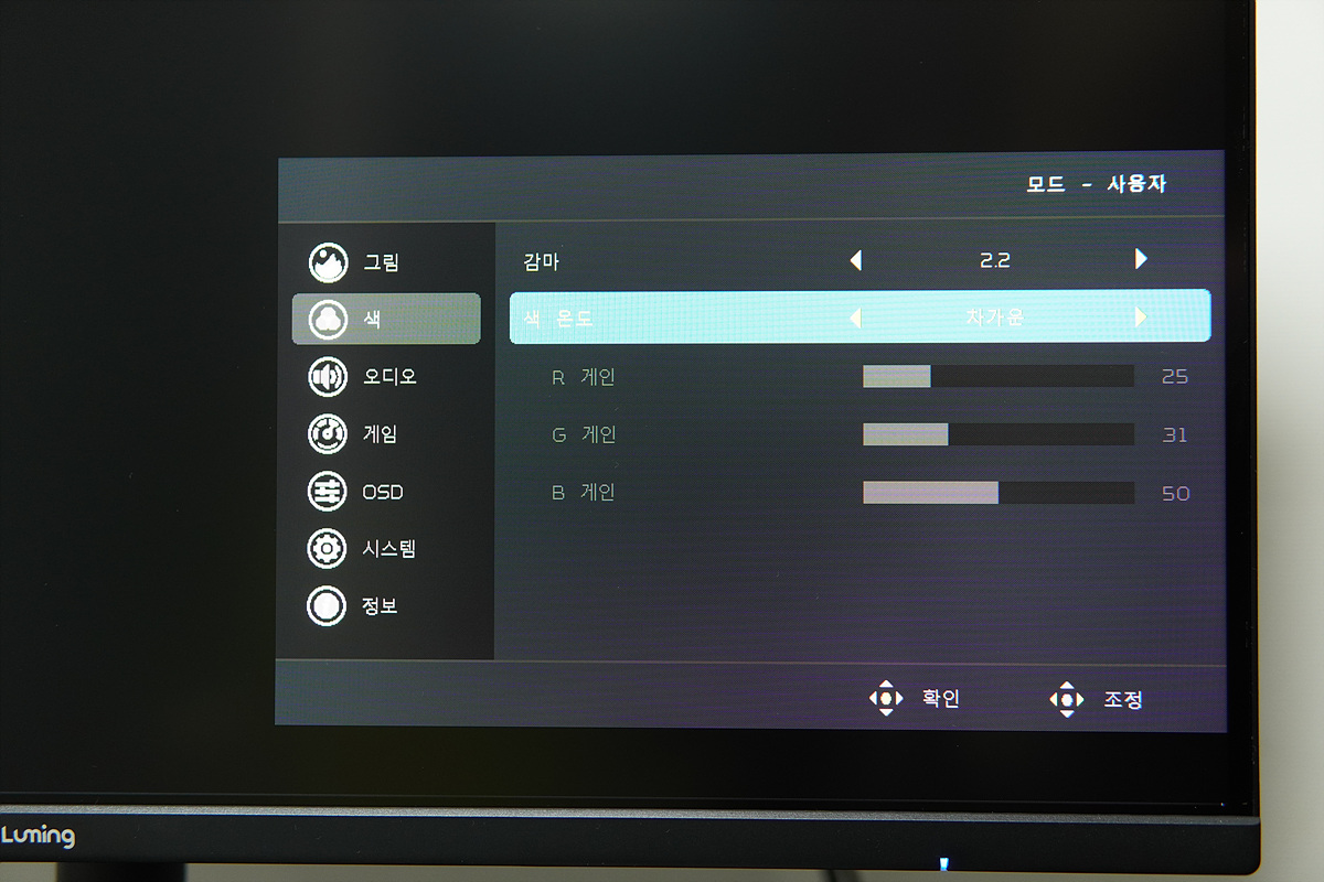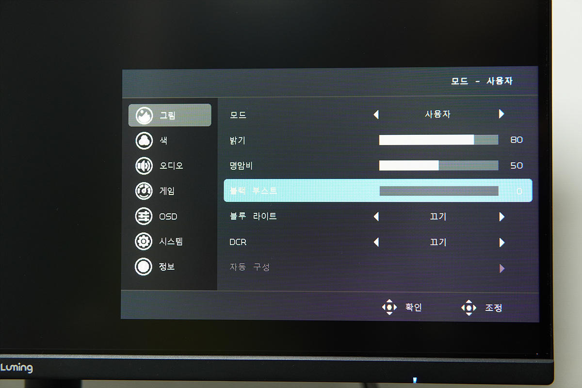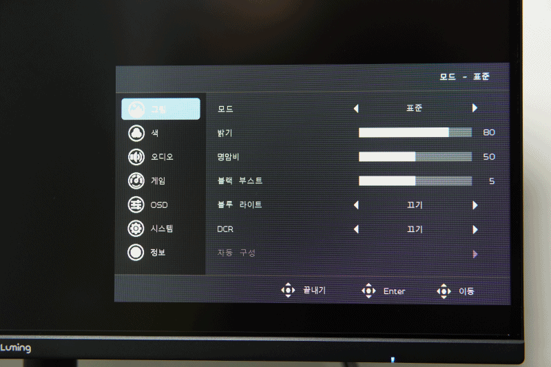 오른쪽의 조그 스틱을 누르면 전원이 켜지고 2초 정도 누르면 모니터의 전원이 켜집니다. 전원이 켜진 상태에서 조그 스틱을 누르면 OSD 메뉴가 나옵니다. 보급형 라인이나 중소기업 모니터들을 테스트하면 대부분 비슷한 OSD 화면을 보게 되는데 한글 폰트나 번역이 이상하게 되어있는 제품들이 많은데 루밍 제품은 이쪽에도 신경을 좀 쓴 거 같네요. 조그 스틱 방향에 따른 빠른 메뉴를 지원하지 않는 부분은 아쉬웠습니다.
