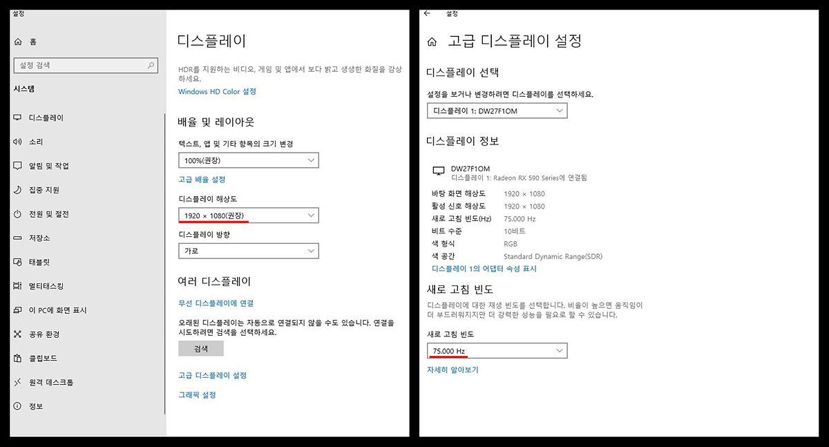 FHD(1,920 x 1,080) 해상도와 75Hz의 주사율을 확인할 수 있습니다.