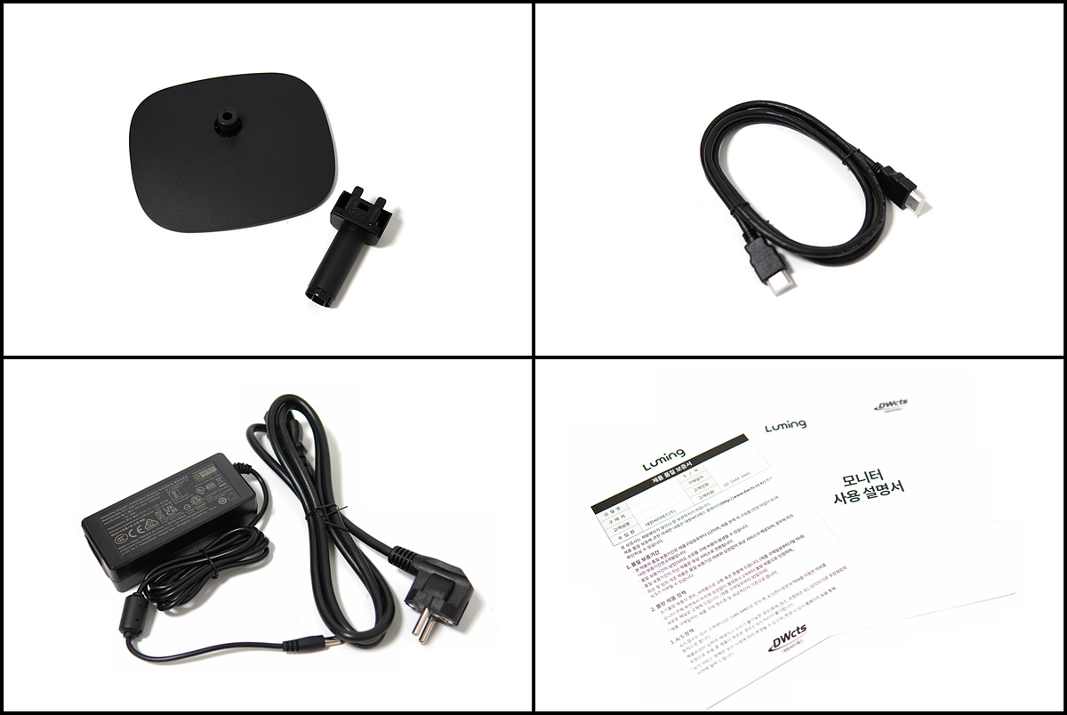 스탠드와 넥(neck)은 별도의 공구가 필요 없이 원터치로 방식으로 조립할 수 있으며 HDMI 케이블 한 개가 포함되어 있습니다. 모니터의 어댑터는 12V / 4A의 출력을 가지고 있습니다.