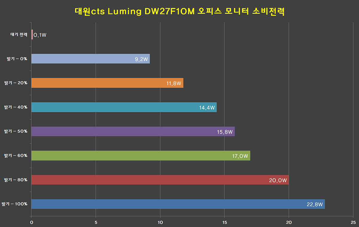 소비전력은 표준 모드에서 밝기 (0 ~100)를 조절해서 측정을 하였습니다. 제가 테스트해본 27인치 모니터에서 가장 낮은 소비전력을 보여주었으며 24인치 모니터와 비슷합니다. 한두 대 정도라면 큰 차이가 없겠지만 사무실과 같이 수십대를 사용하는 곳에서는 크게 차이가 나는 수치입니다.