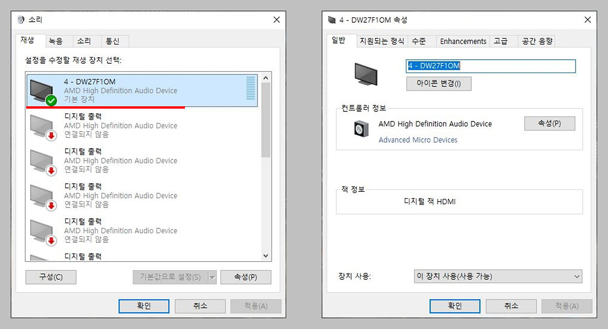 HDMI 케이블로 연결하면 내장 스피커를 사용할 수 있습니다. 혹시나 소리가 출력되지 않으면 제어판 -> 소리에서 모니터를 선택한 뒤 기본 장치로 설정해야 합니다. D-Sub 케이블이라면 바로 연결되지 않고 3.5mm 케이블을 모니터에 연결해야 합니다.
