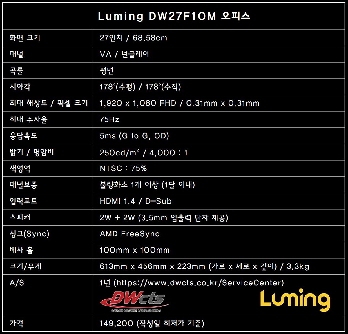게이밍과 사무용 모니터를 구분하는 기준은 없지만 게이밍 모니터들은 대표적으로 144Hz 이상의 고주사율을 지원하지만 이 제품은 75Hz의 주사율을 가지고 있습니다. VA 넌글레어 패널이 장착되어 있으며 100mm 베사홀이 있어서 모니터 암을 사용할 수 있습니다. 저는 모델명으로 제품의 특징이나 라인업을 확인할 수 있는 제품을 좋아하는데 DW27F1OM는 이런 직관적인 이름을 가지고 있습니다. DW은 대원cts를 27F는 27인치 평면(flat)을, 1은 첫 번째 OM은 오피스 모니터를 가리키는 거 같습니다. (제 뇌피셜이기는 하지만 맞을 거라 생각합니다. ^^)