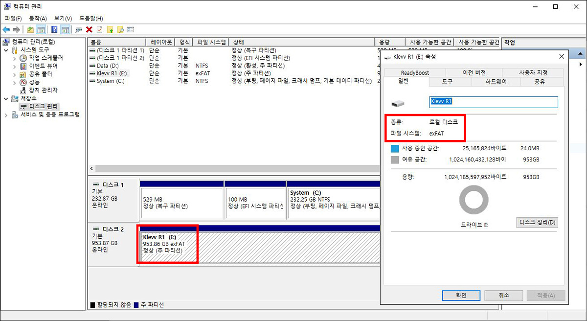 외장형 저장장치들은 내장과 다르게 기본적으로 디스크 할당과 포맷이 되어있어서 바로 사용할 수 있습니다. 파일 시스템은 exFAT로 되어있어서 Windows뿐만 아니라 Mac, 안드로이드, IOS와 같은 다양한 환경에서 별다른 설정 없이 바로 사용할 수 있습니다.