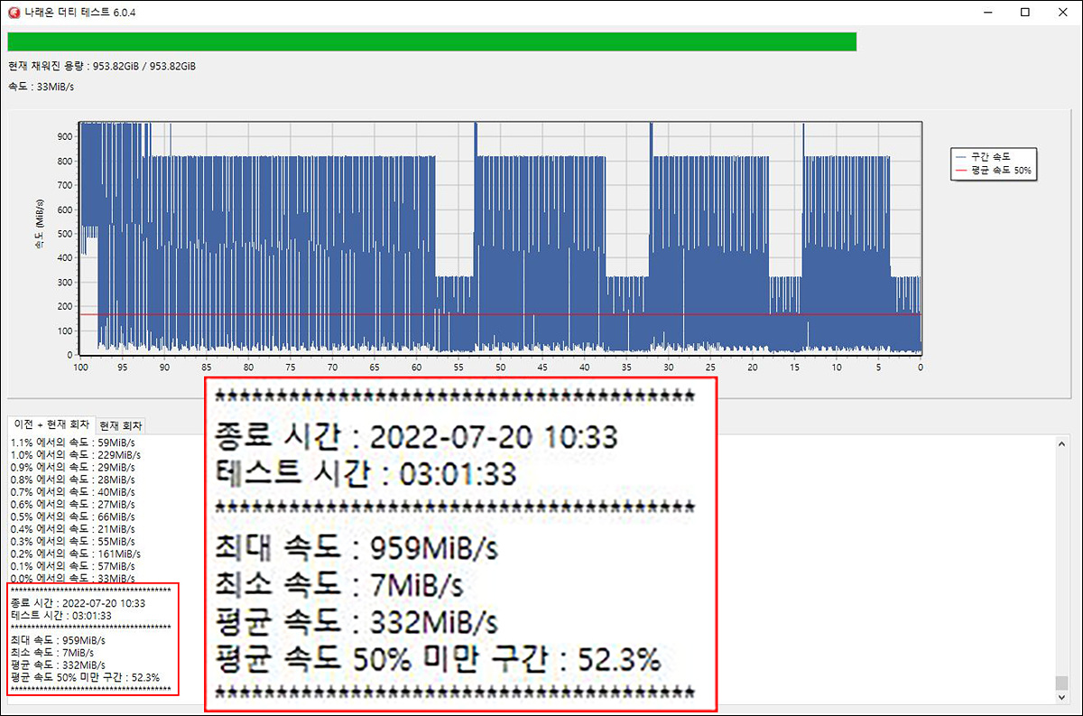 0 ~ 100%까지 SSD의 모든 구간을 쓰는 나래 테스트는 디램리스(DRAM-less) SSD의 특성을 그대로 보여주었습니다. 개인적으로는 외장형 저장장치의 쓰기 속도는 크게 따지지 않는 편이지만 저장장치에서 속도는 곧 성능과 이어지는 부분이기 때문에 속도를 중요하게 생각하는 사용자들에게는 아쉬운 부분이죠.