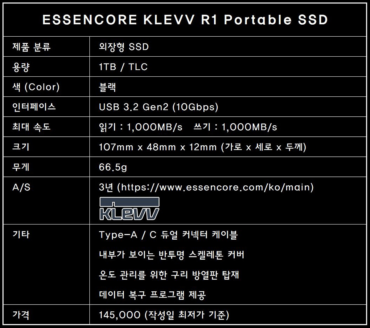 이번 시간에 소개하는 클래브의 제품은 T1 광고의 RGB 메모리가 아닌 R1 포터블 SSD입니다. R1은 500GB / 1TB 두 가지가 있으며 읽기, 쓰기 모두 같은 스펙을 가지고 있습니다. USB 3.2 Gen2의 인터페이스로 데이터를 빠르게 전송할 수 있으며 Type-C 포트를 통해서 기기(플랫폼)에 상관없이 어디서나 사용할 수 있습니다. 제품의 외형과 성능에 대해 자세하게 살펴보도록 하겠습니다.