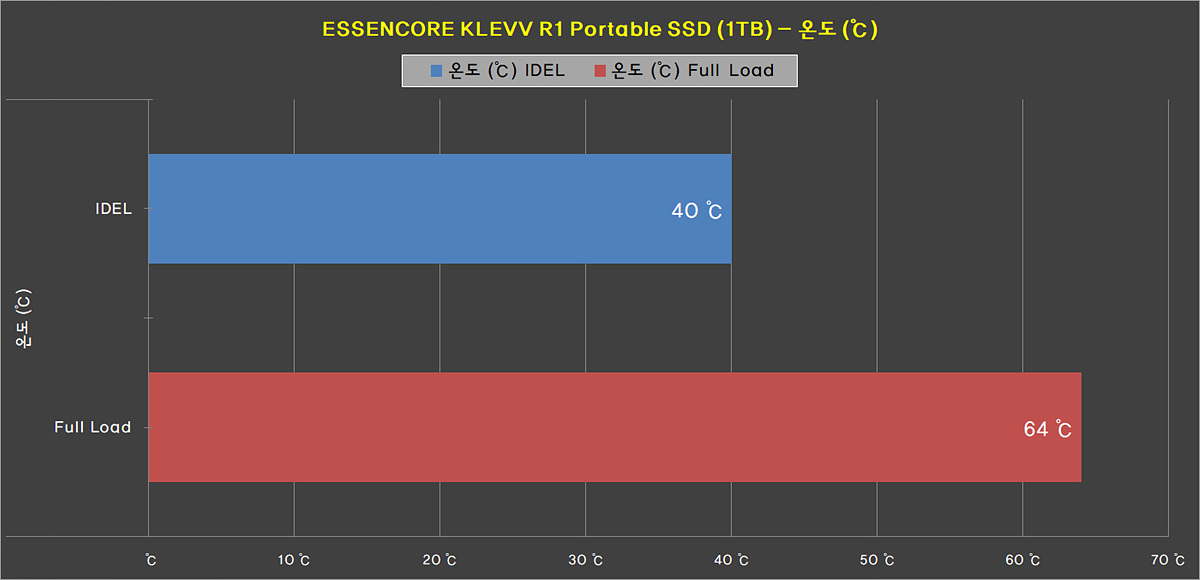 0 ~ 100%까지 SSD의 모든 구간을 쓰는 나래 테스트는 디램리스(DRAM-less) SSD의 특성을 그대로 보여주었습니다. 개인적으로는 외장형 저장장치의 쓰기 속도는 크게 따지지 않는 편이지만 저장장치에서 속도는 곧 성능과 이어지는 부분이기 때문에 속도를 중요하게 생각하는 사용자들에게는 아쉬운 부분이죠.