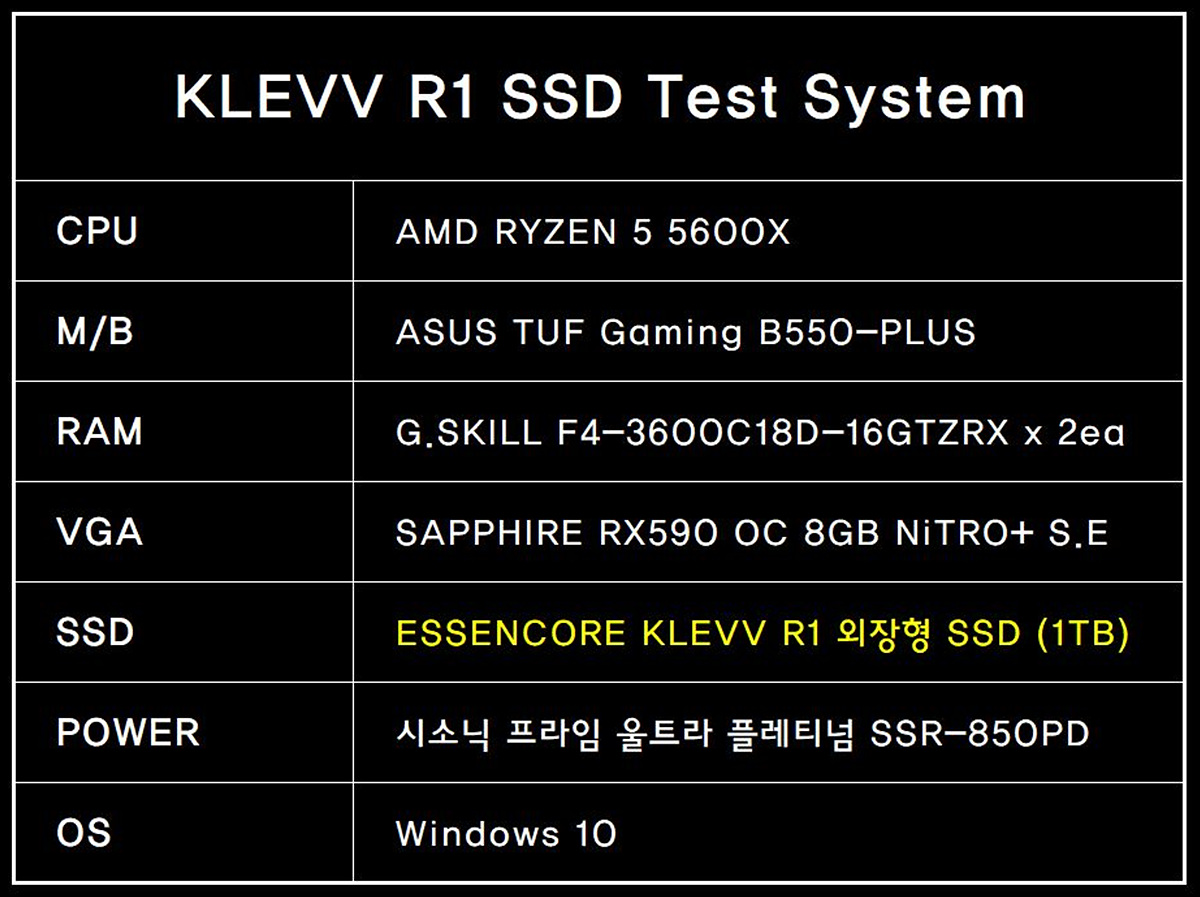 클래브 R1 외장 SSD를 테스트할 시스템 사양입니다.