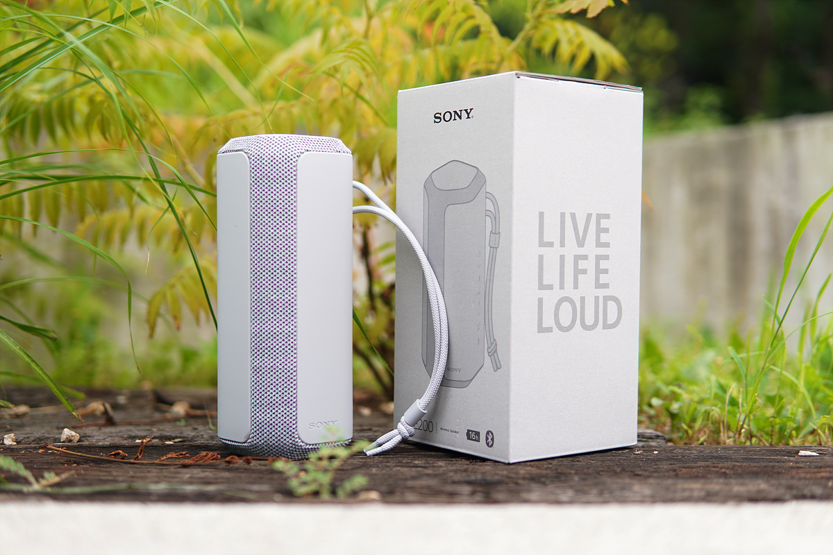 SRS-XE200 스피커의 특징들과 함께 슬로건인 "Live Life Loud"를 확인할 수 있습니다.