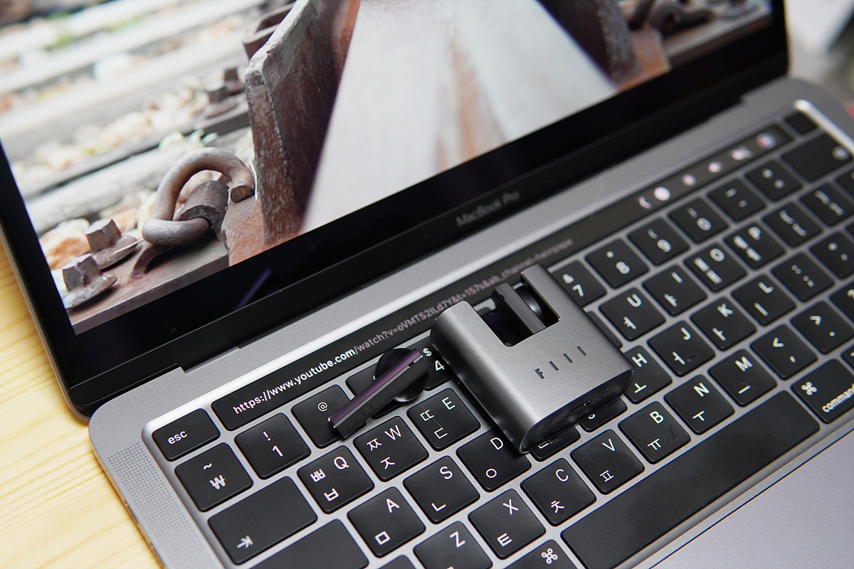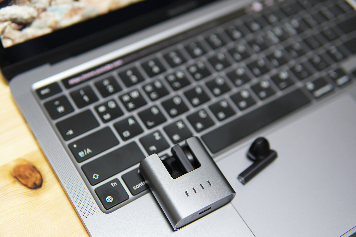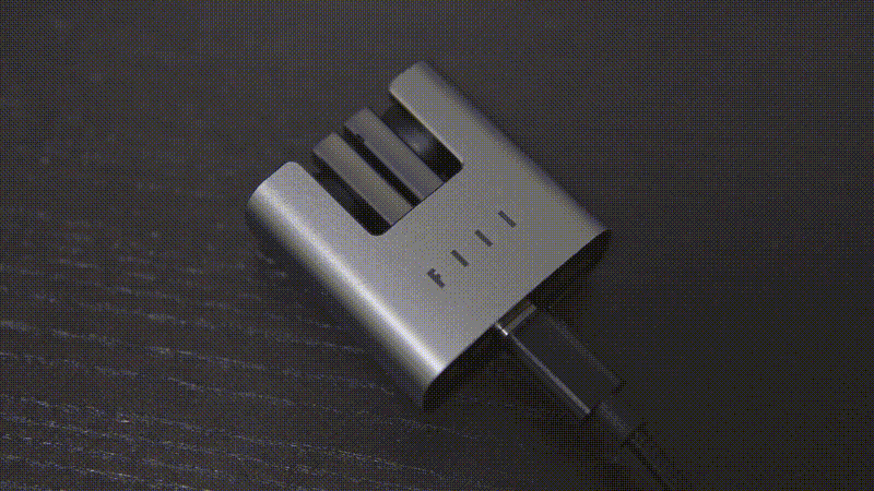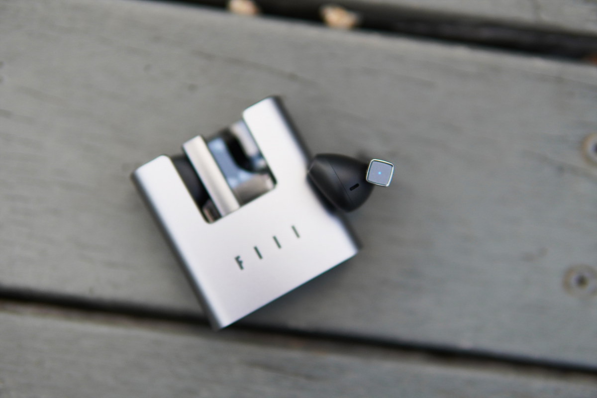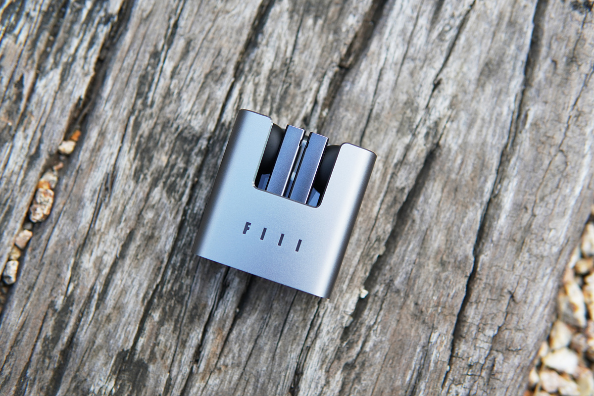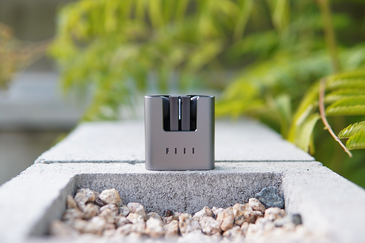 케이스 전체는 알루미늄 재질로 상당히 깔끔하며 애플 기기의 스페이스 그레이와 거의 똑같은 색입니다. 앞쪽에는 FIIL 로고가 있으며 커버(뚜껑)가 없는 다소 특이한 모양을 하고 있습니다.
