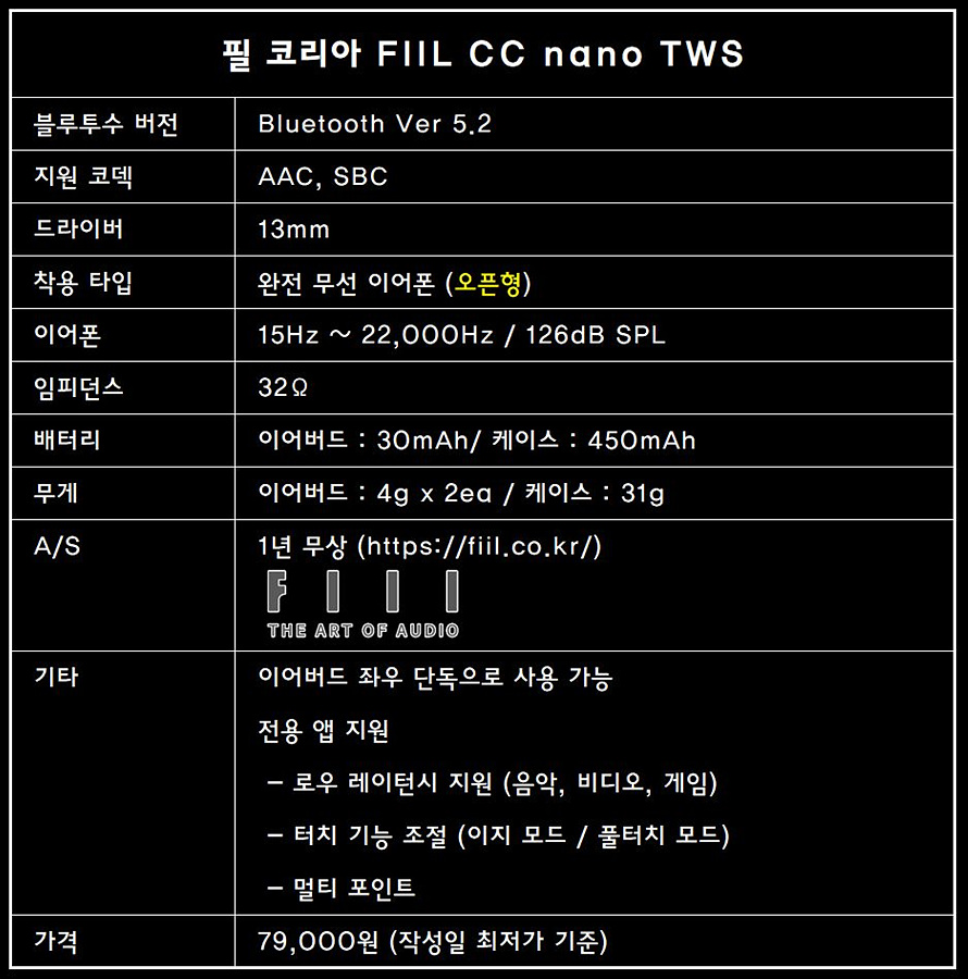 커널형과는 다르게 오픈형 이어폰은 현재 시장에 출시되는 제품이 그리 많지 않으며 TWS 방식의 이어폰은 훨씬 더 적은 편입니다. 그래서인지 유선과 무선을 막론하고 이어폰 = 커널형이라는 생각을 하게 되죠. 이번 시간에 소개하는 FIIL CC nano (필 씨씨 나노)는 기존의 커널형과는 다른 오픈형 방식의 블루투스 이어폰입니다.