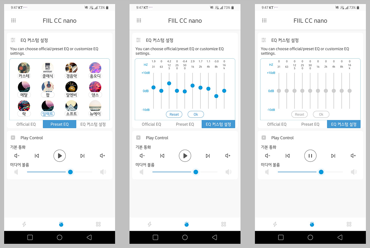 저음이나 고음 강화뿐 아니라 여러 가지 프리셋으로 쉽고 편리하게 적용할 수 있으며 10 밴드로 EQ를 사용자에 맞게 조절할 수 있으며 리셋을 누르면 초기화할 수 있습니다.